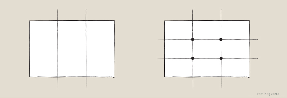 El espacio -generalmente rectangular- se divide en tercios horizontales y verticales. Es decir, queda divido en 9 partes. Los cuatro puntos interiores que determinan la intersección de las líneas los llamaremos «puntos fuertes». Se recomienda que el elemento protagonista, el punto focal, quede ubicado en uno de estos puntos.