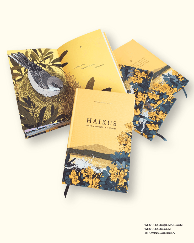 Colección de 68 poemas haikus ilustrados a doble página, impresión a color sobre flora y fauna chilena. Encuadernación tradicional, 100% hecha a mano, de tapa dura y cuadernillos cosidos. Incluye listado científico de especies.