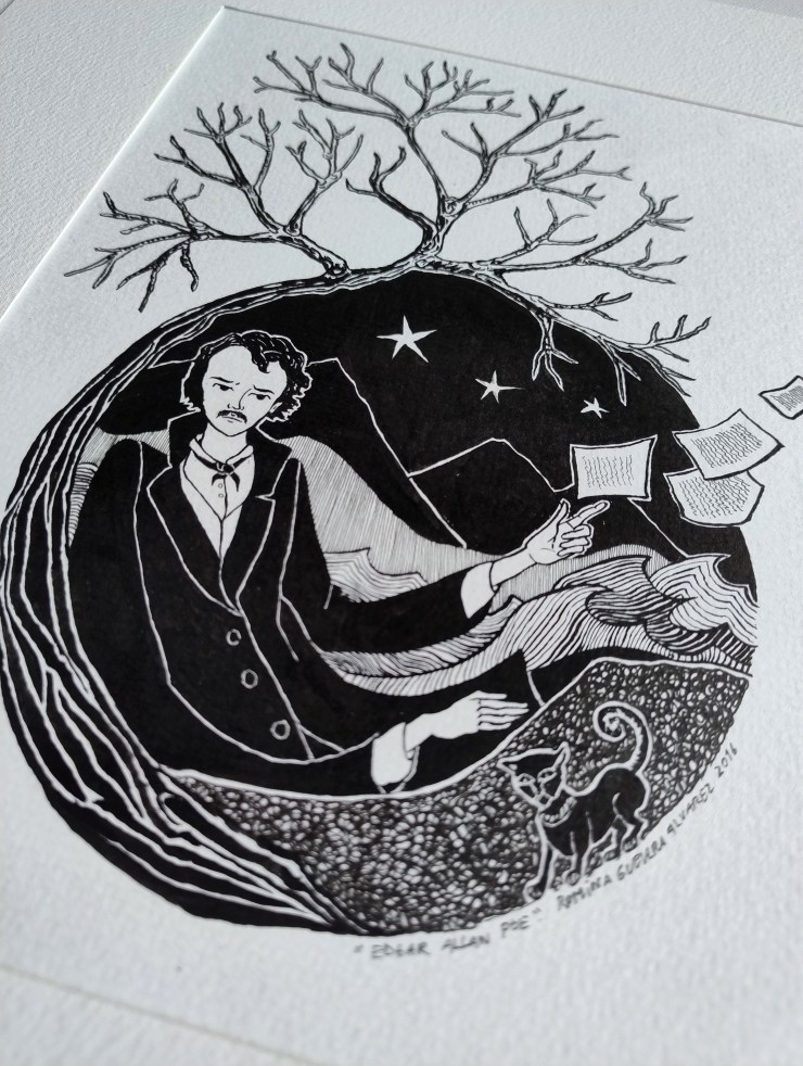 Obra original inspirada en el universo simbólico y literario de Edgar Allan Poe. En un entorno onírico, el autor se ve envuelto por ramas desnudas, cielos estrellados, hojas flotantes y mares oscuros, elementos que evocan lo inquietante y lo bello de su obra. Realizada en tinta negra con técnicas tradicionales (plumilla, pincel y lápiz), esta ilustración única captura la esencia del imaginario gótico y poético de Poe. Obra única firmada por la artista, 2016.