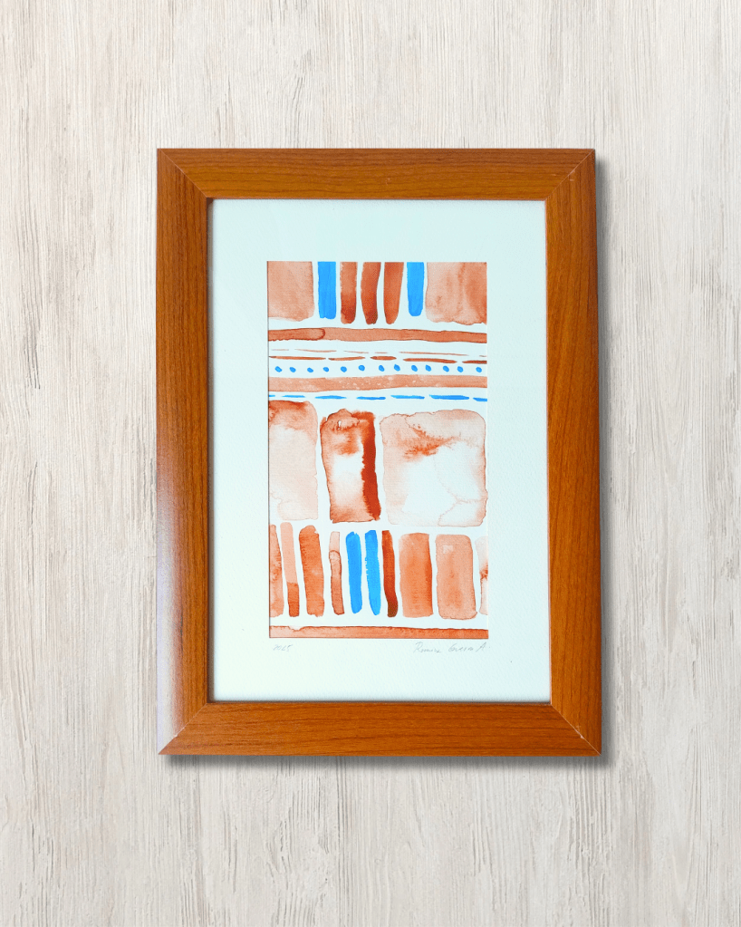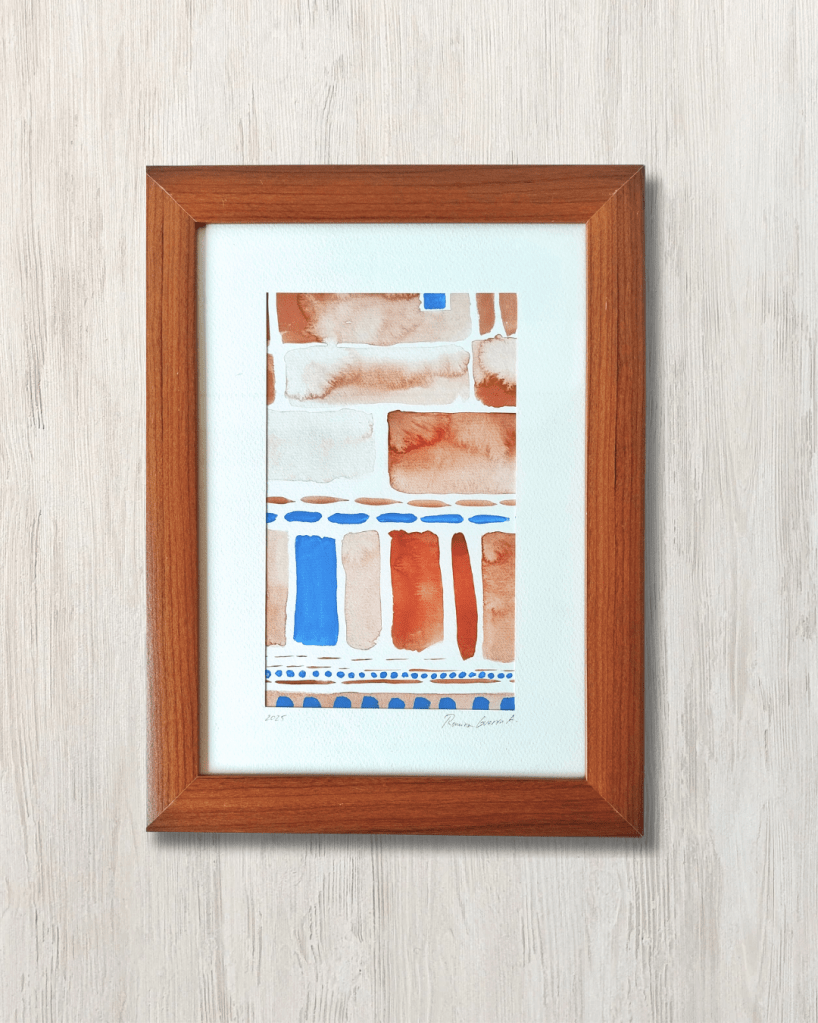 | Técnicas y materiales | Acuarela y acrílico sobre papel de 300gr. Paspartú de papel de algodón de 300gr. Marco básico color siena (desmontable, incluido) |