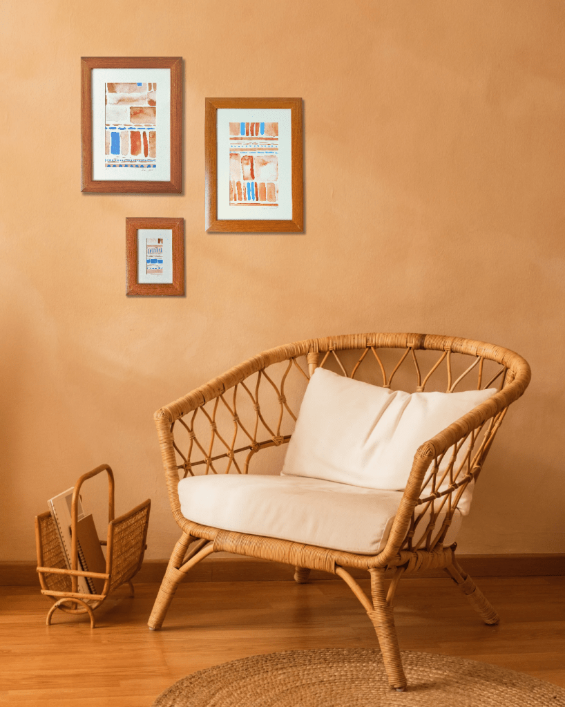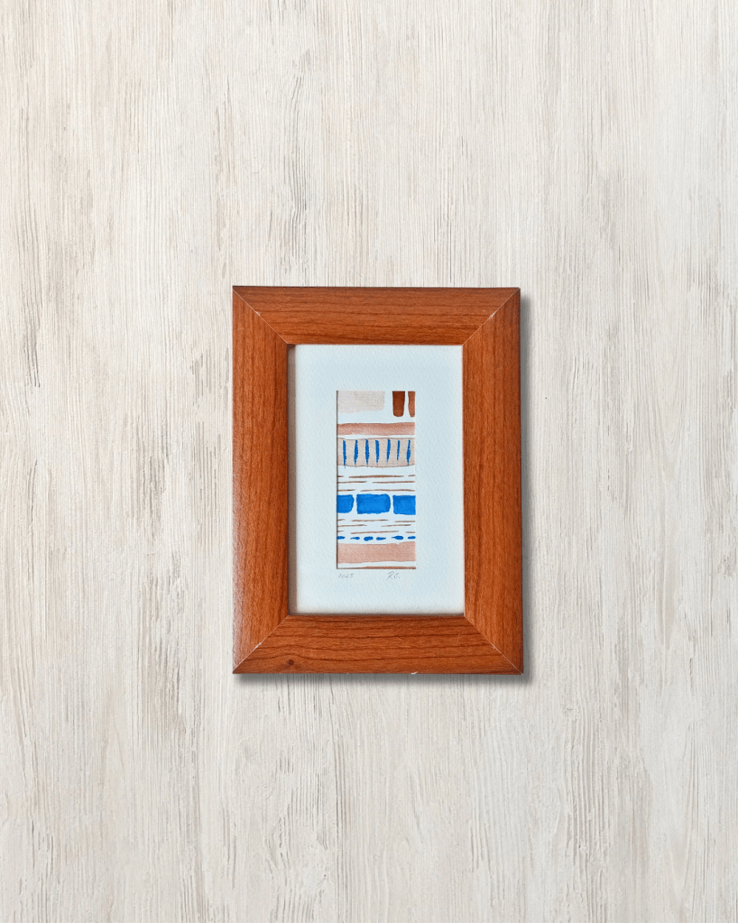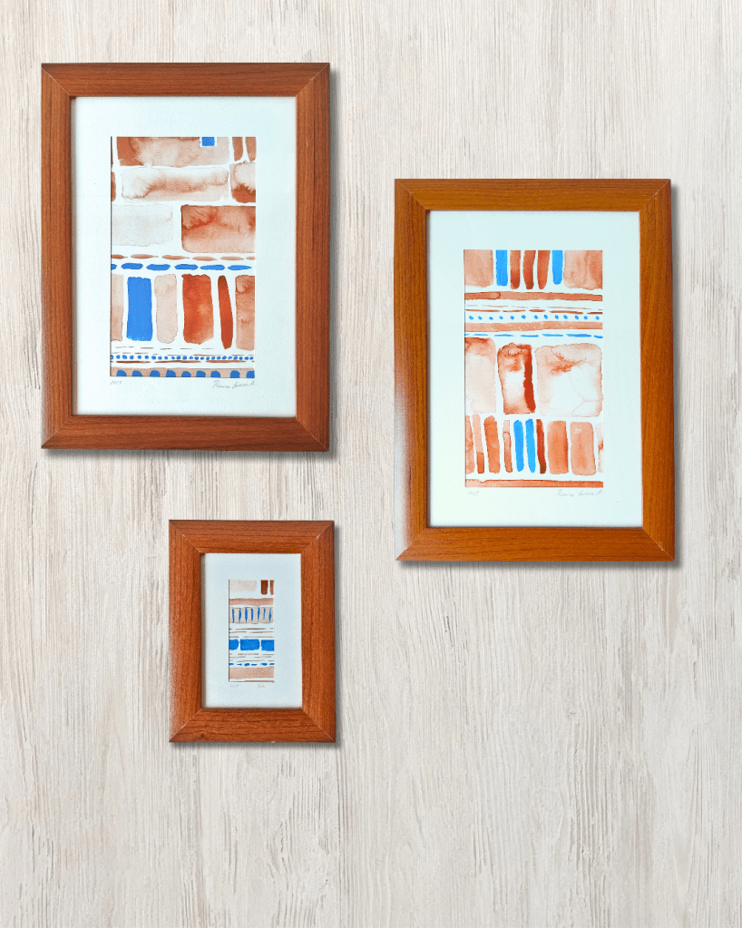 Las obras se entregan listas para colgar. El marco es sencillo y desmontable, ideal para conservar o reemplazar según la preferencia del comprador.