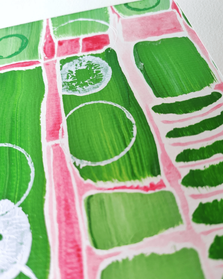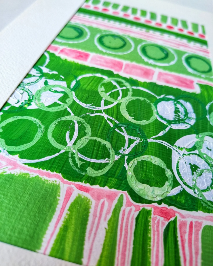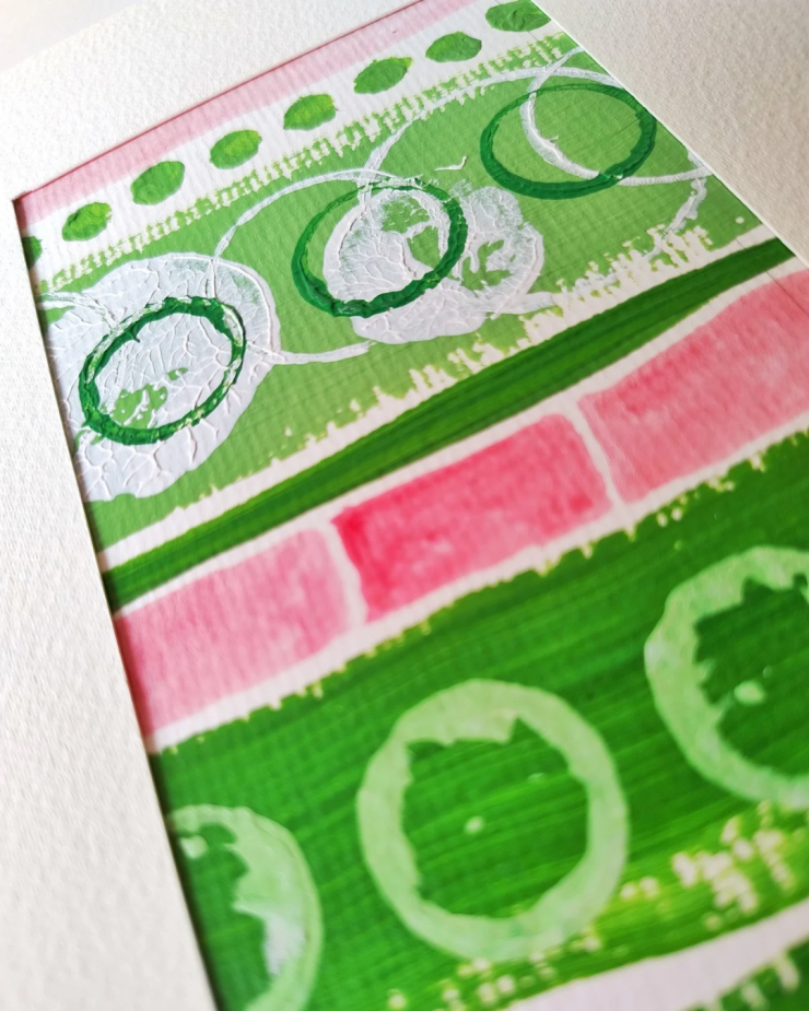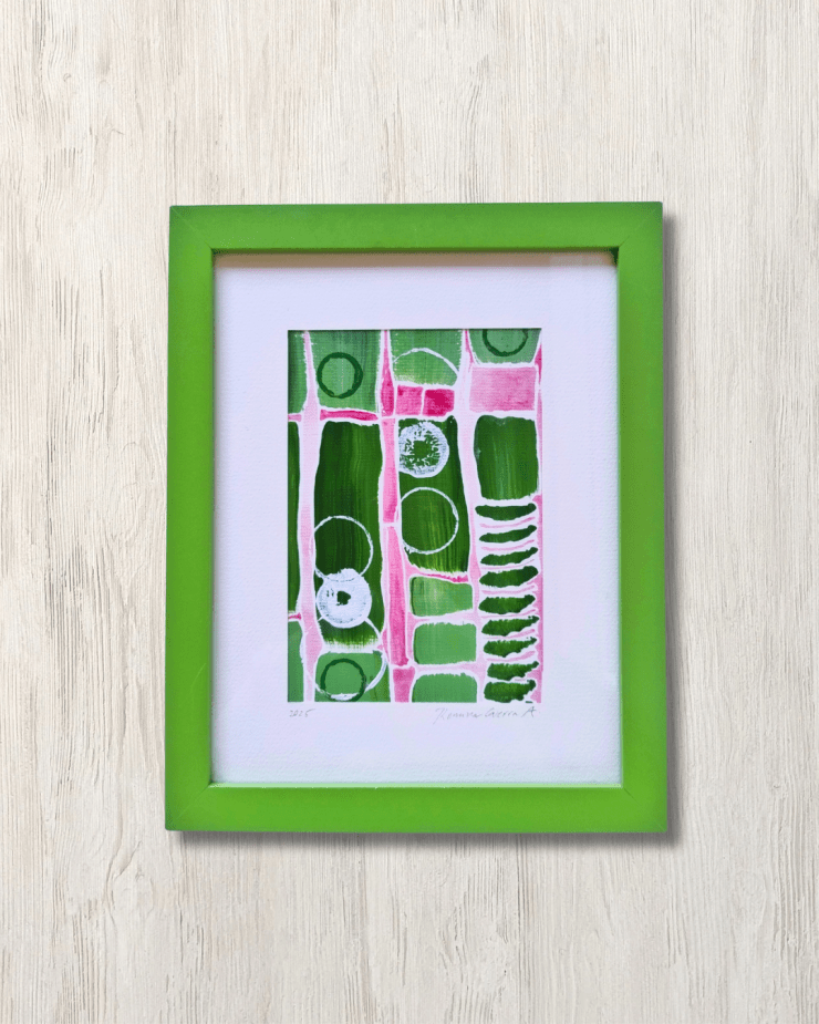 Obra compuesta por tres piezas que combinan bloques de color acrílico en tonos verdes y blancos, intervenidos con toques de acuarela roja en los intersticios. La composición integra trazos libres, formas geométricas y círculos que evocan formaciones celulares o estructuras vegetales. Inspirada en la naturaleza microscópica, esta trilogía abstracta juega con la repetición, la fragmentación y el vacío, generando un ritmo orgánico entre lo vivo y lo visual. Una exploración del orden natural y su belleza latente.