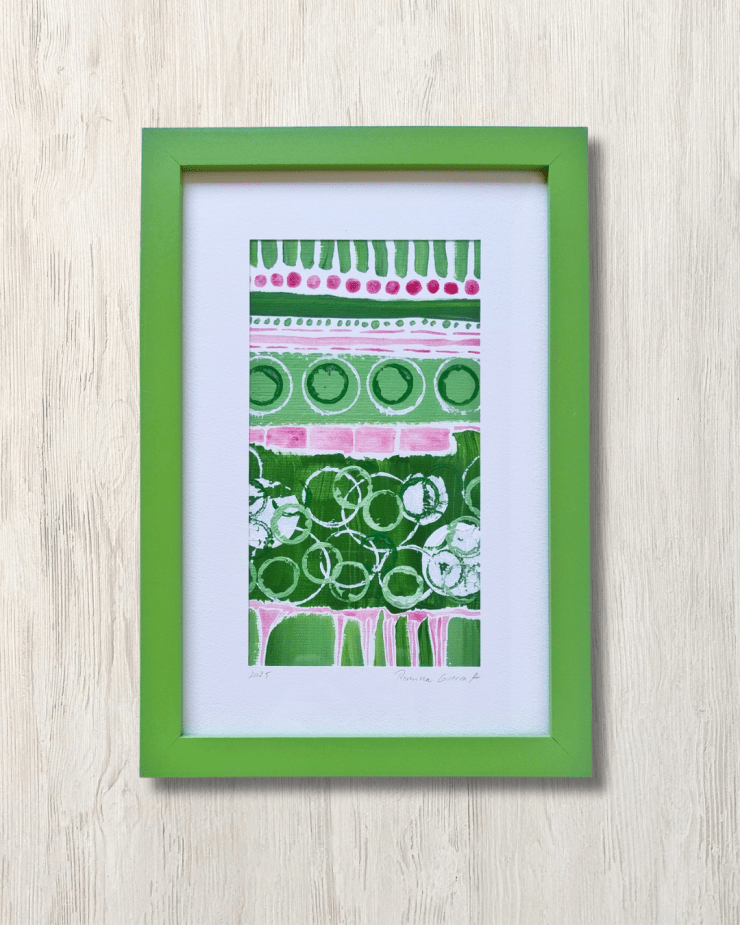 Las obras se entregan listas para colgar. El marco es sencillo y desmontable, ideal para conservar o reemplazar según la preferencia del comprador.